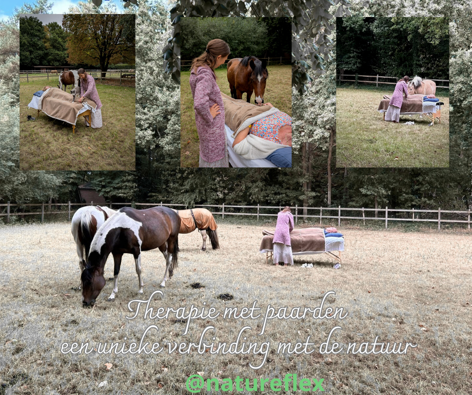 Paarden zijn uitzonderlijk gevoelig voor onze energie. Ze voelen haarfijn aan wat er in ons omgaat en kunnen ons helpen om blokkades en trauma’s los te laten. In een sessie met paarden combineren we de helende werking van hun energie met verschillende therapeutische technieken, zoals voetreflexologie, cranio-sacrale therapie of energetische behandelingen. Dit alles vindt plaats in de open natuur, waar je zintuigen volledig tot rust komen.